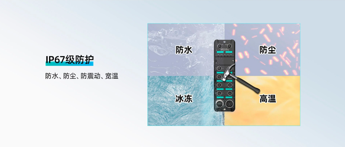 隨著工業(yè)自動(dòng)化技術(shù)的不斷發(fā)展,現(xiàn)場設(shè)備面臨的運(yùn)行環(huán)境越來越復(fù)雜:高溫、低溫、粉塵、油污、潮濕甚至高壓水沖洗等嚴(yán)苛條件,因此對(duì)工業(yè)通信與控制模塊的可靠性提出了更高要求;而傳統(tǒng)的工業(yè)模塊在這種環(huán)境下容易出現(xiàn)故障,影響生產(chǎn)線的穩(wěn)定性與效率。德克威爾推出的 IP67 高防護(hù)型模塊,旨在為制造業(yè)、物流、能源等行業(yè)提供穩(wěn)定可靠的信號(hào)采集與傳輸解決方案;以下,上海育展將從產(chǎn)品特色、典型應(yīng)用場景以及詳細(xì)技術(shù)規(guī)格三個(gè)方面進(jìn)行解析,幫助您更完整的了解該系列產(chǎn)品的優(yōu)點(diǎn)與應(yīng)用價(jià)值。